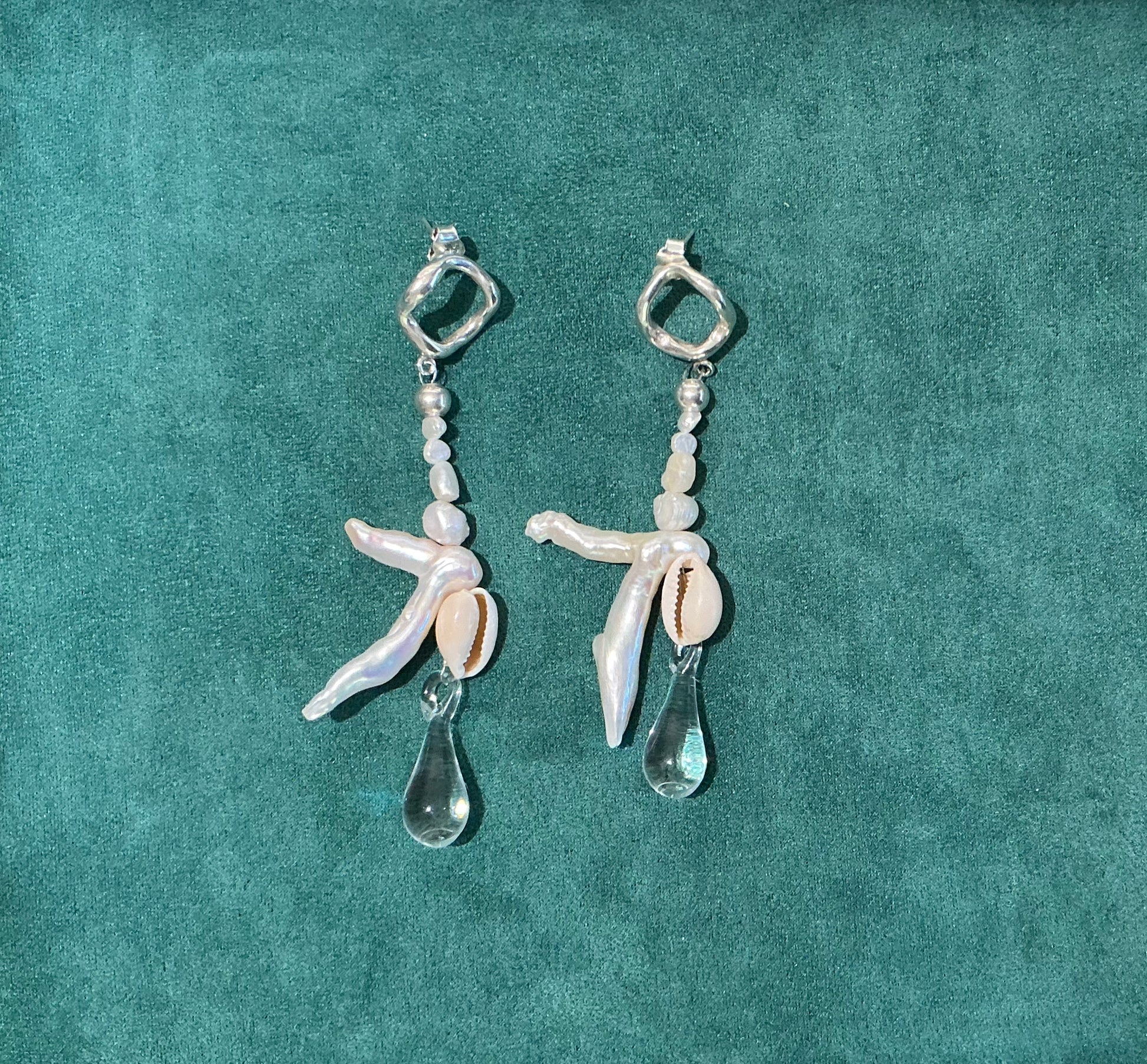 Aretes esculturales y orgánicos. Cada par es una una composición única de vidrio, concha, perlas y nuestra icónica forma "onda" en plata .925.