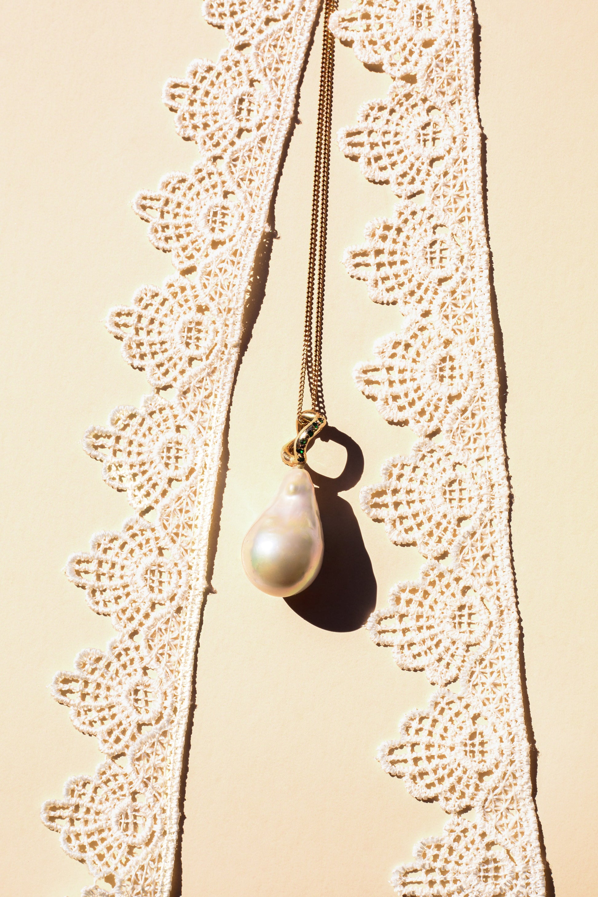 Dije Ileana hecho con una perla barroca y nuestra icónica onda hecha en oro, pieza clásica y atemporal perfecta para usar en tu día a día.